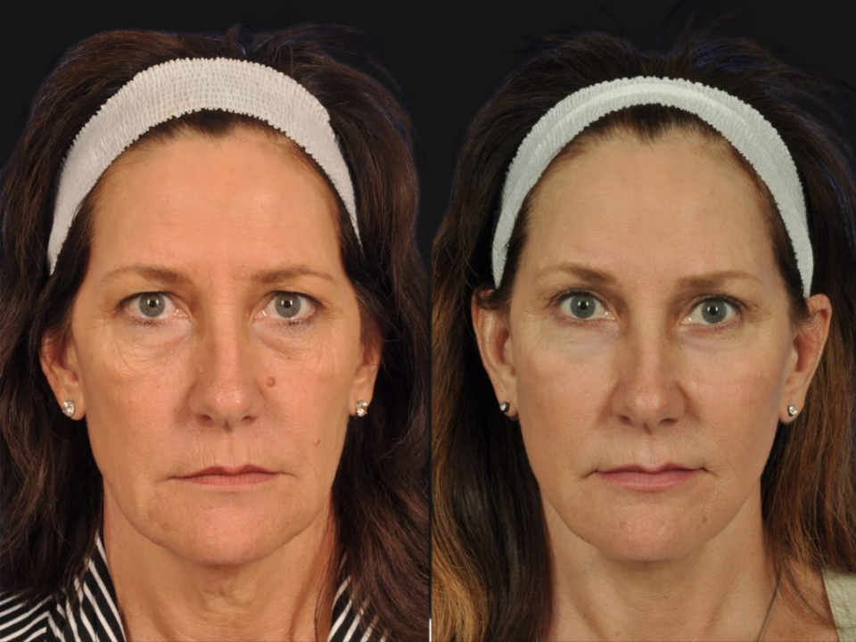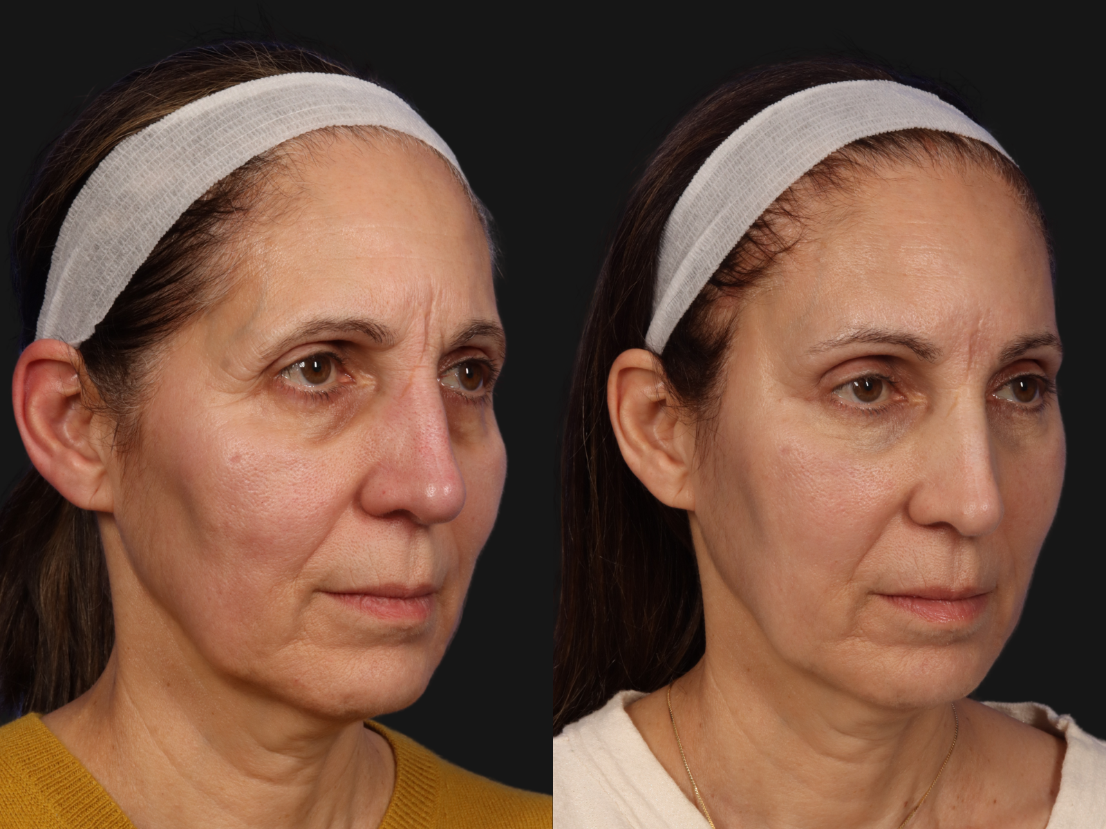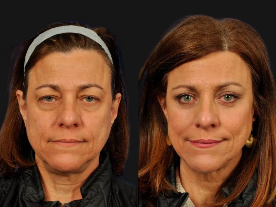 51 year-old woman shown before and after upper and lower blepharoplasty, endoscopic brow and WNatural Micromidfacelift™.