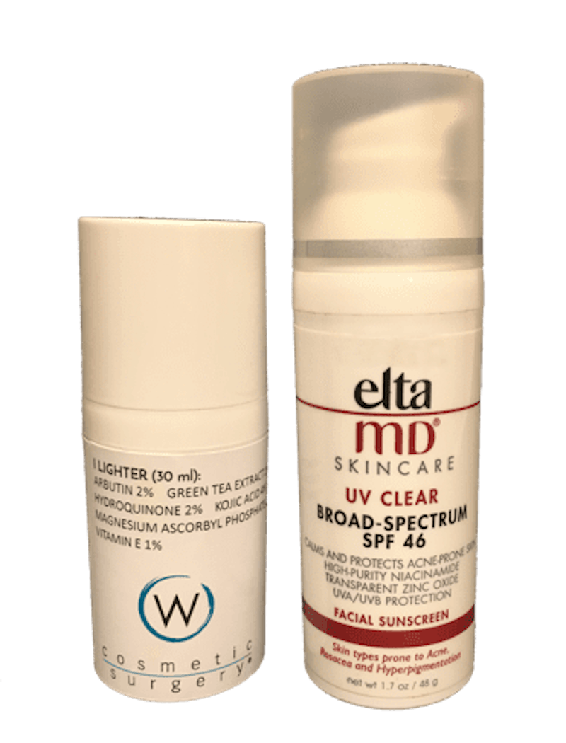 As a special bonus, we are offering introductory pricing on a fantastic new product that will take this W Skin special to the next level. We’re offering our new “I Lighter” combined with our Elta MD sunscreen for just $75 plus tax (a 20% discount). The I-lighter is part of our brand new, customized line of W Skin products. This product has gentle skin lighteners that will help brighten your skin year round.